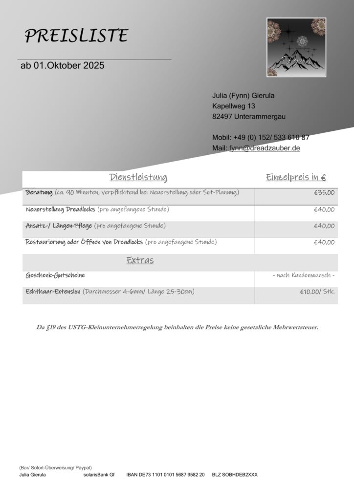 Eingegangene Anzahlungen werden nach erfolgter Dienstleistung verrechnet. Bitte daher unbedingt auf Verwendungszweck achten bei Überweisungen, um die Anzahlung auch dem entsprechenden Termin zuordnen zu können!